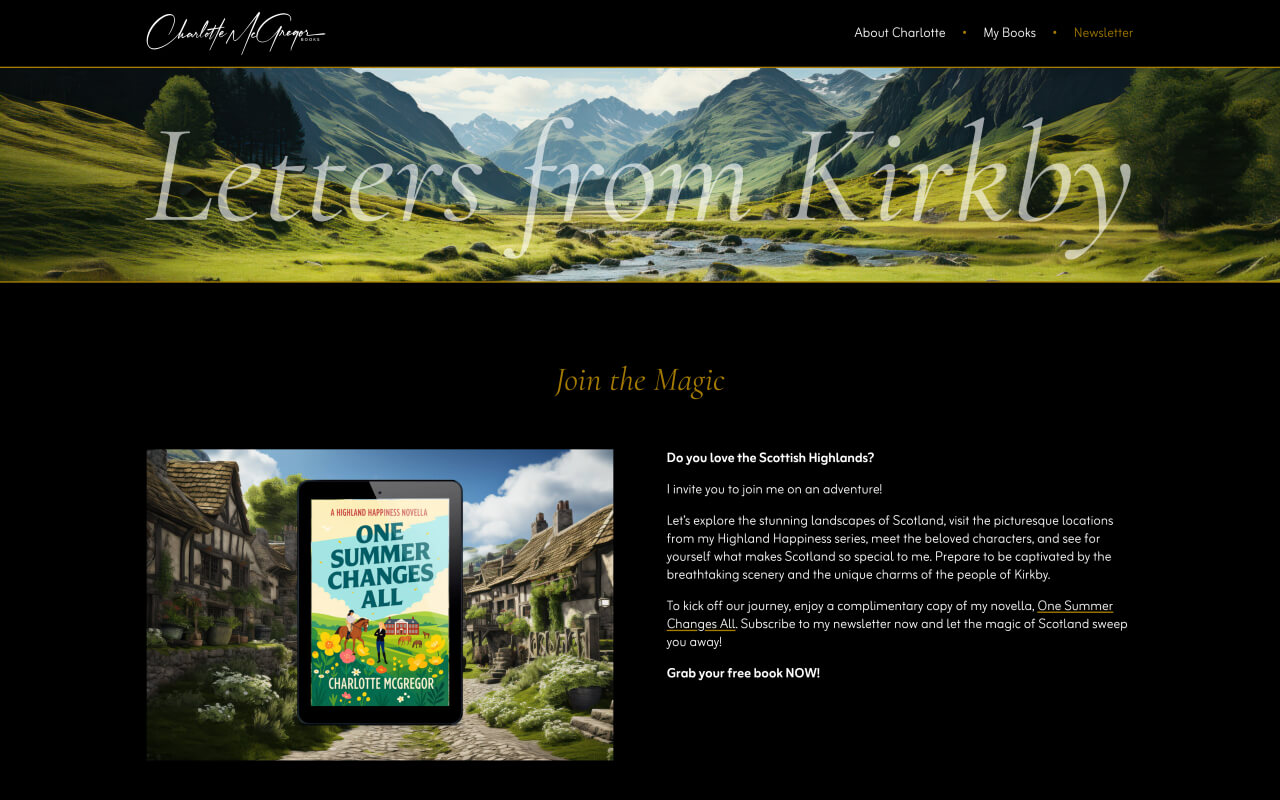 Charlotte McGregor ist die schottische Persona der deutschen Autorin Carin Müller. Für die Bewerbung der englischsprachigen Ausgabe ihrer erfolgreichen "Highland Happiness"-Serie, habe ich diese schlicht-elegante Website erstellt.