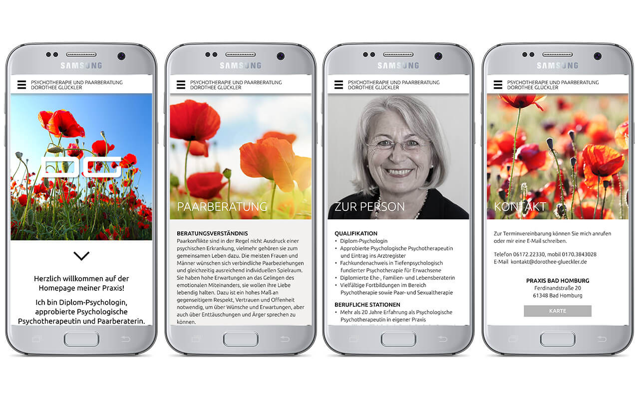 Für die Diplom-Psychologin Dorothee Glückler mit Praxen in Bad Homburg und Frankfurt entwarf Christiane Peters von pukka design einen sehr freundlichen, modernen und klar aufgebauten Onepager, dessen leuchtende Bilder über einen Parallax-Effekt besonders zur Geltung kommen.